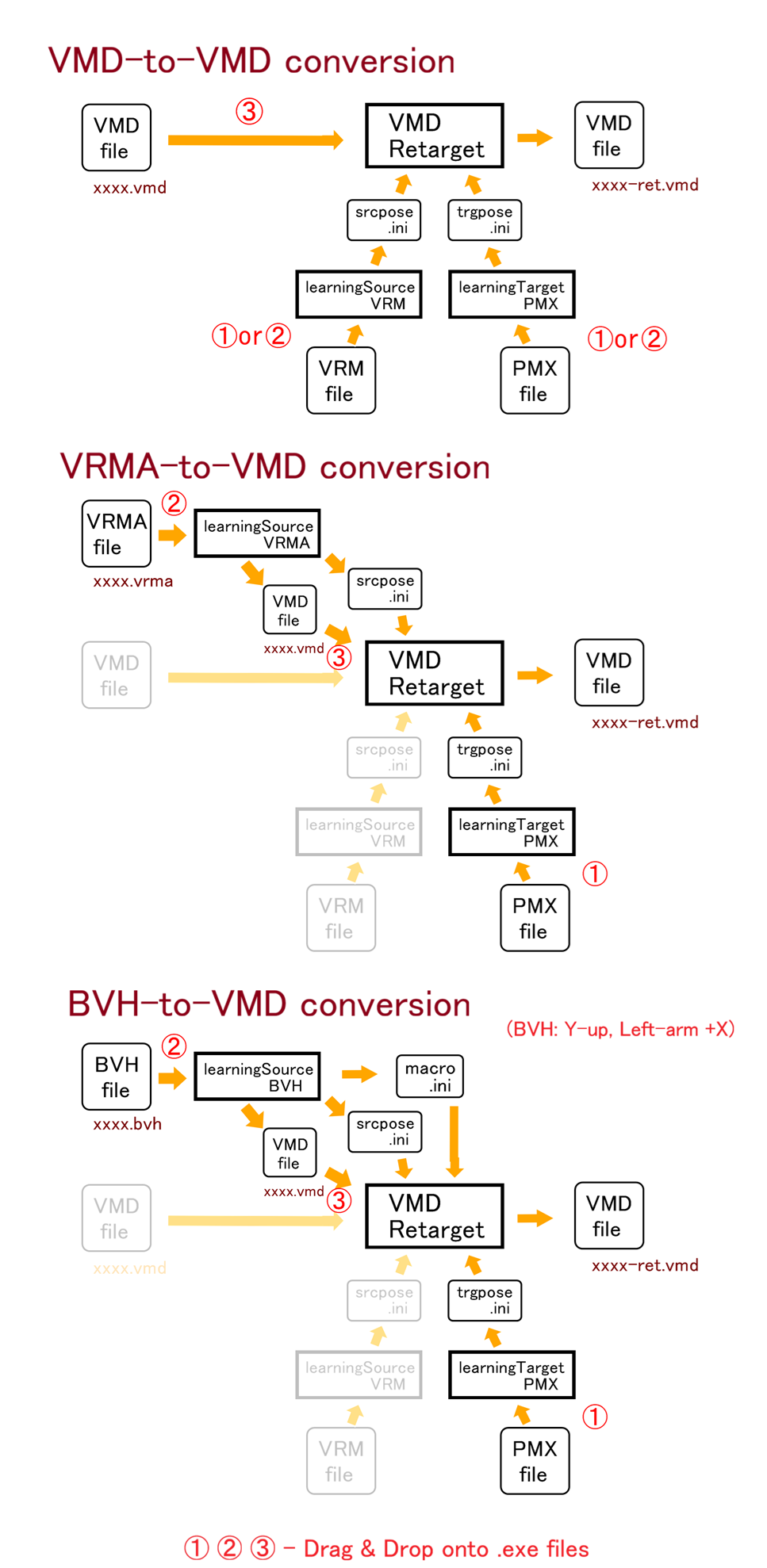 REVLBTC set: VMD Retarget V1.21i7 REVLBTC reverse-conversion set, vmdretarget121i7-revlbtc.zip (1297kB), for converting non-standard motion using Center bone for lower-body attitude control. Drag-and-Drop the source PMX model onto both learningSourcePMX and learningTargetPMX, and then drag-and-drop the motion VMD onto VmdRetarget.